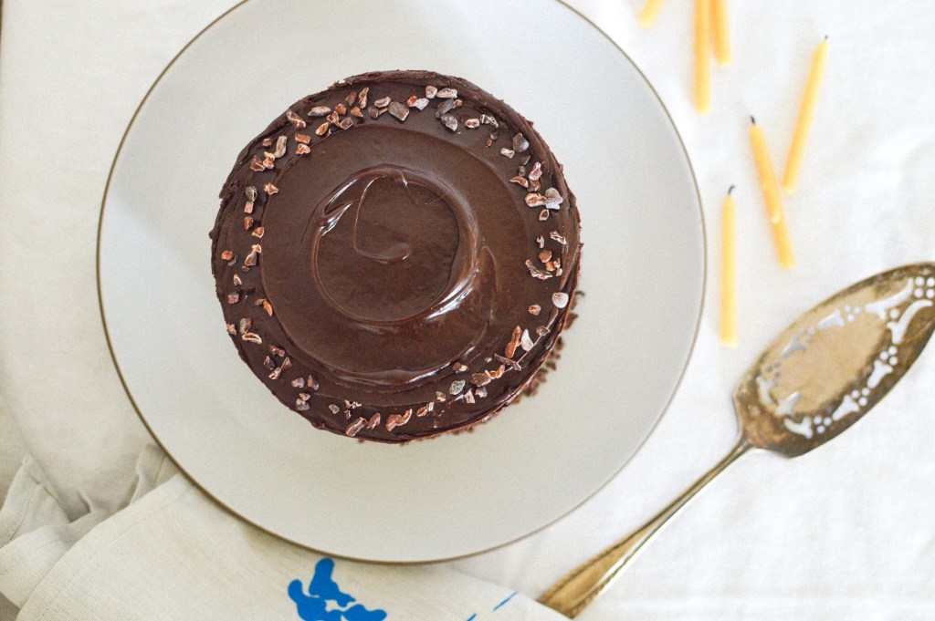Decorate your cake with a piped light-colored frosting, cocao nibs, nuts of your choosing, anything chocolatey, stiffly whipped cream, or anything else you can think of. Enjoy!