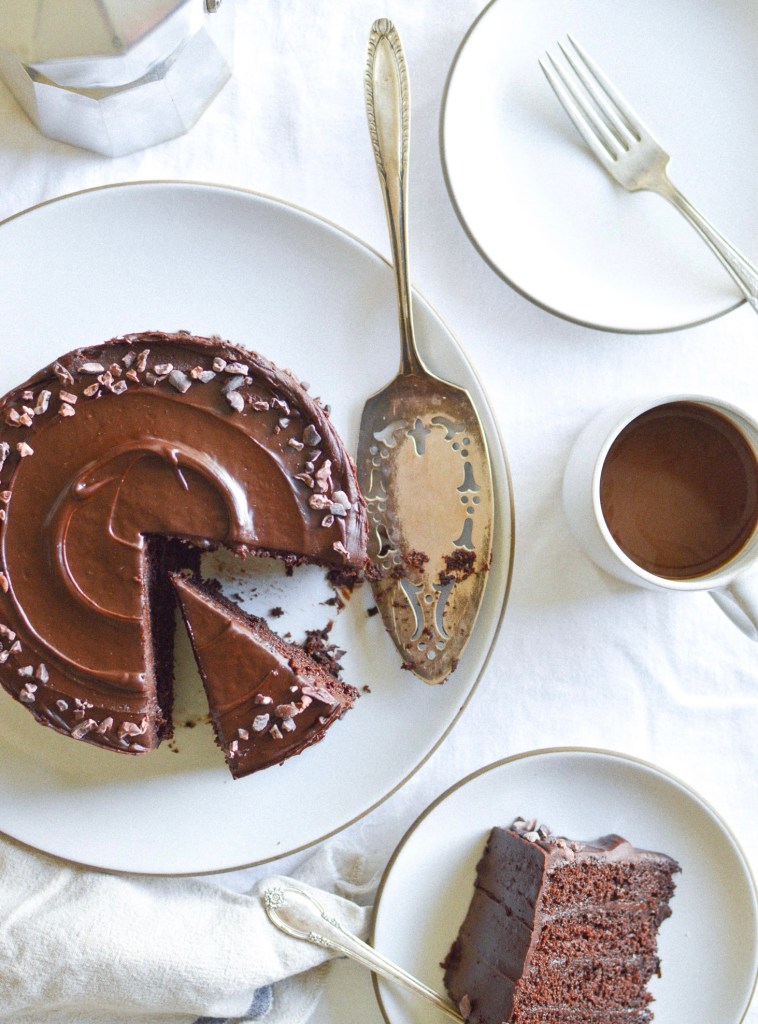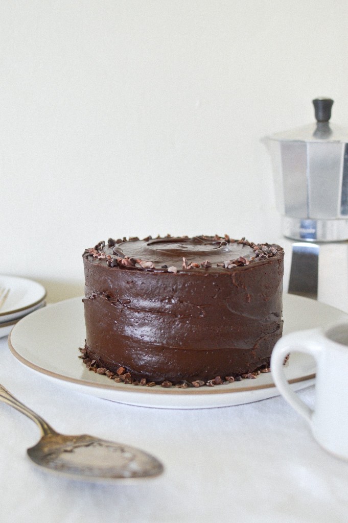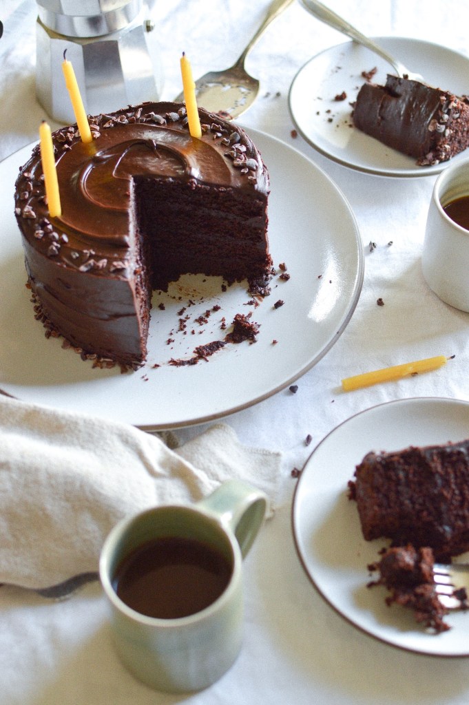The frosting may change each time depending on how much powdered sugar you decide to add, but never fear—it will always taste great. I generally make two layers and then cut them each in half to make four total layers, but this is your cake journey so do whatever you want. It also holds up relatively well to gluten free flours, but it will be extra moist and therefore much harder to slice in half. (I spent a couple of years making cakes for people who were choosing to eat only gluten-free baked goods, and though on a couple of occasions the middles sunk quite badly, the GF cinnamon-chocolate cakes always tasted excellent despite the rather wonky appearance.) It’s a forgiving cake, and easy enough to bake even with a little koala baby holding tight to half of your body.