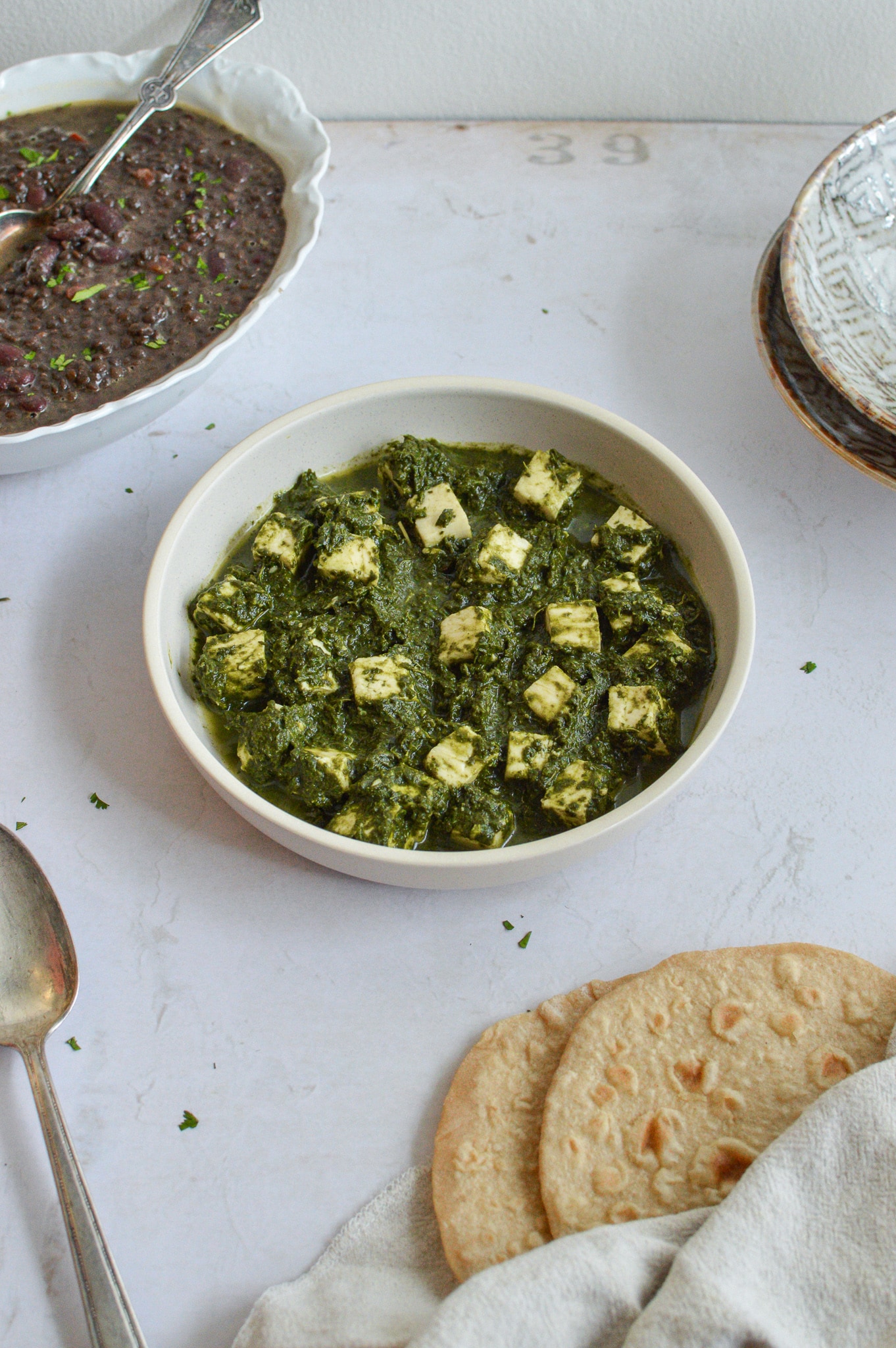 Given that I’m mostly Irish and I only visited India once, I’m no expert on Indian food. Mostly when I crave it we order from Zareen’s, a fantastic local Indian-Pakistani restaurant that I wish I could order from once a week—it’s that good. Since I’m no pro, when I cook Indian food I try to seek out the most authentic recipes. I salivated over all of Chetna Makan’s recipes when she was on the Great British Bake Off several years ago, so I’m not that surprised that her books have consistently given me fantastic results. This recipe is no exception; it’s insanely simple and chock-full of vibrant, healthy greens, and it’s fantastic next to daal, rice, yogurt, and cubed sweet potato roasted with coconut oil and salt. Boost your experience by adding in a sweet and sour pickle or chutney, or even homemade chapati. Paneer is basically like eating cheese for dinner, which I assume is a dream come true for anyone.
