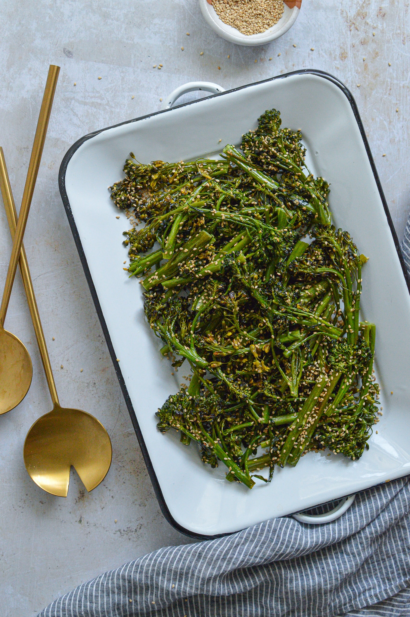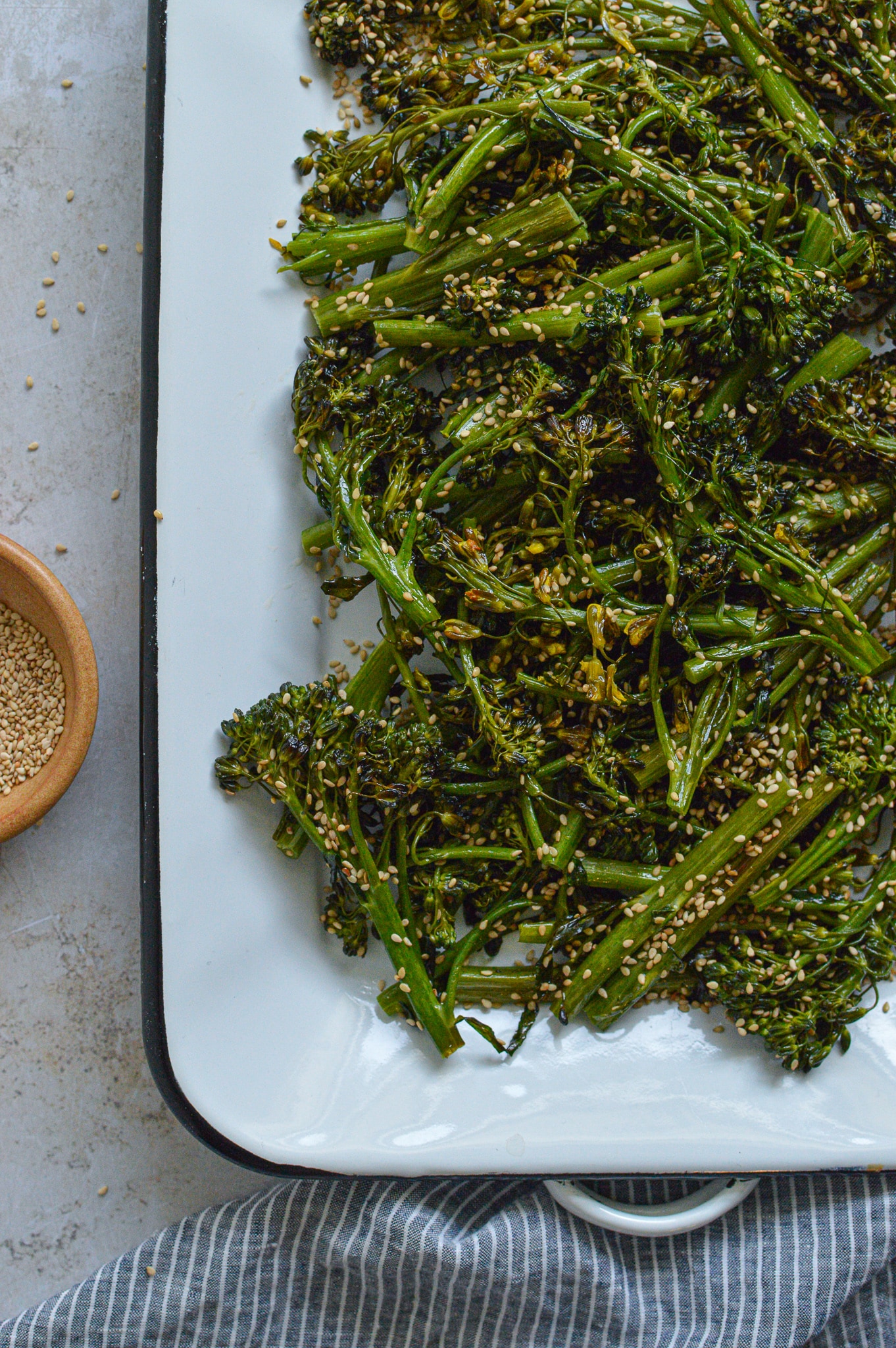 One thing we’re excited for are more casual dinners with family and friends. The other day we were over at my parents’ for dinner and Mom topped roasted broccolini with a hefty dose of sesame seeds, which perfectly complimented the vegetable’s natural sweetness. My mom has been obsessed with sesame seeds for years; they coat her sourdough bread inside and out, she rolls all cookies in them before baking, and they’re sprinkled on any savory or sweet recipe she can get away with. Plus, her motto for years has been, “Love yourself and eat sesame seeds.” Serve this broccolini alongside any roasted meat or add to a stir-fry at the very end.