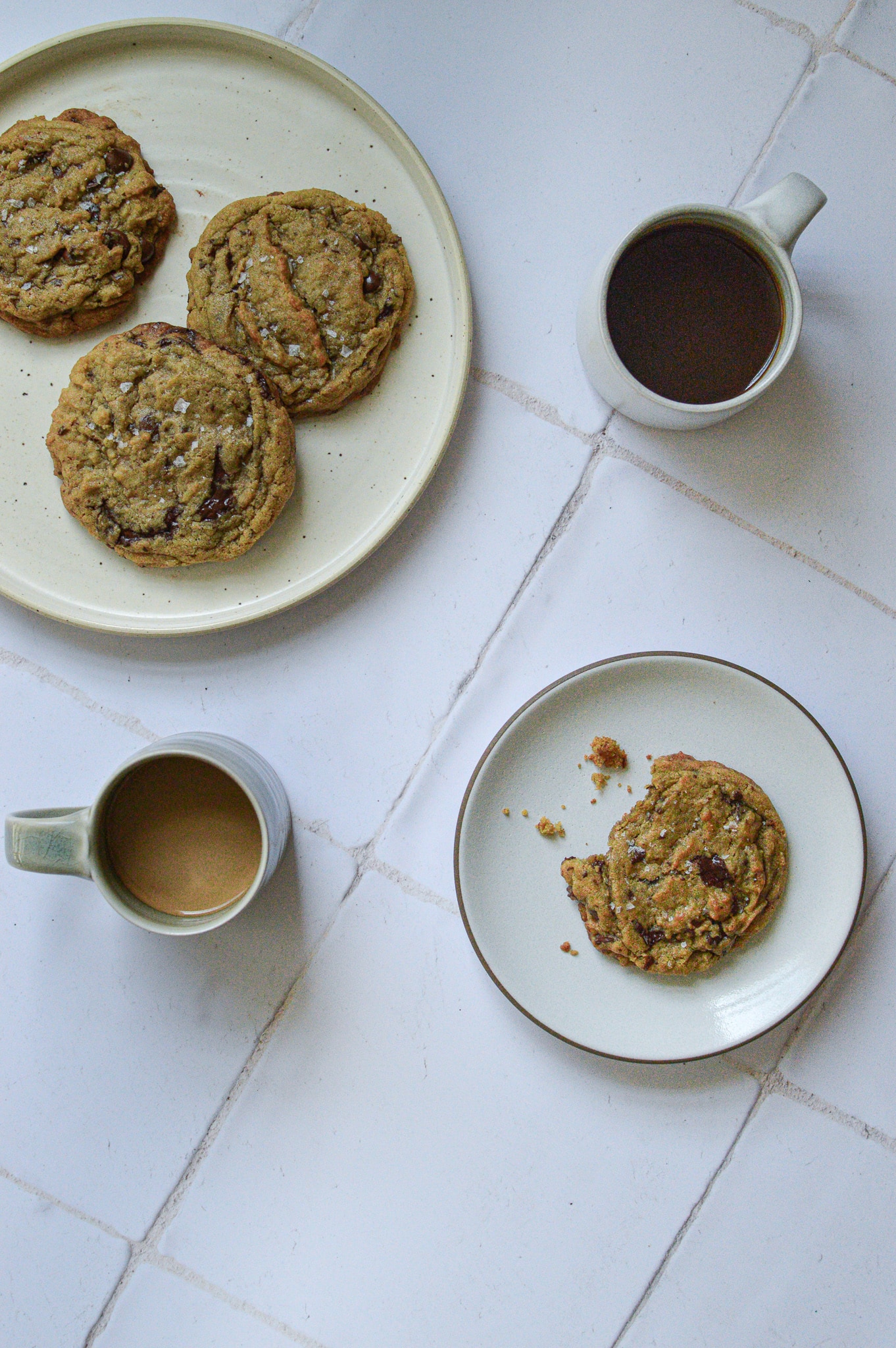 I recently realized that my dream chocolate chip cookie was, oddly, the one from my middle school cafeteria. I don’t often reminisce about middle school; those were confusing times—I wore the same outfit every day for a year and was so embarrassed by my sweaty armpits that I would swelter in a sweatshirt all day. But, hey, it could have been worse, and clearly something good (the aforementioned cookies) came out of it. At lunch my friends and I would scrounge together two dollars (a splurge, I know), approach the cafeteria window which we never otherwise interacted with, and order a cookie. It would be handed back to us, grease darkening the wax paper bag it lived in for only a few seconds before we devoured it. I had to try really hard not to take more than my share (anyone who knows me well will be surprised I was able to control myself at all)! The cookie was crisp and buttery on the edges but gooey, almost undercooked, in the middle. Fragrant golden cookie surrounded decadent, melty chunks of chocolate, and it was pure heaven. It would always be gone before we knew it, leaving me wanting three more for myself.