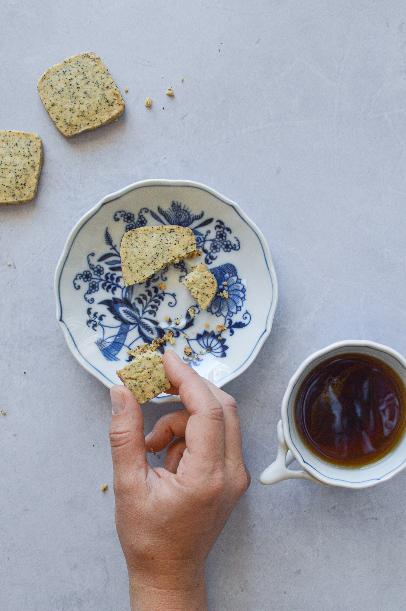Companion Bakeshop is one of Santa Cruz’s star food spots, and for good reason: they churn out excellent sourdough loaves, phenomenal chocolate croissants, savory pinwheels, and delicious crumbly buckwheat scones almost every day—we’re lucky to have them. We recently stopped by the bakery with some good friends before a day out on the town, and got a decadent assortment of treats. Everything was superb (I do love a good kouign amann), but the humble little square of Earl Grey shortbread in the corner of the box stole the show for me. Buttery, crumbly, and lightly fragrant from the tea, it was hard for me not to hoard all three square inches of cookie to myself. A day later, I began attempting to recreate that little wonder of a cookie. After several batches mainly spent tweaking the amount of tea (the answer always seemed to be more tea), I feel like I’ve finally found the right ratios. The Earl Grey flavor is faint, a wonderful, floral background to the prominent nutty, buttery flavor of the shortbread, and that’s how I like it. Feel free to up the amount as you see fit. The lemon zest is also very light, but helps lift the shy Earl Grey and allows it to shine. These cookies are so good I cannot stop eating them—which just goes to show that my truest nature is probably closer to that of a Cookie Person.