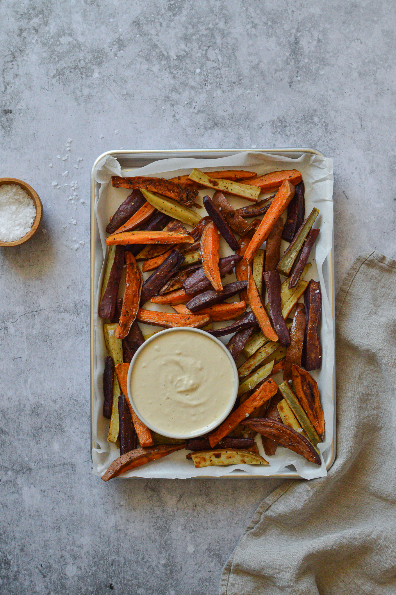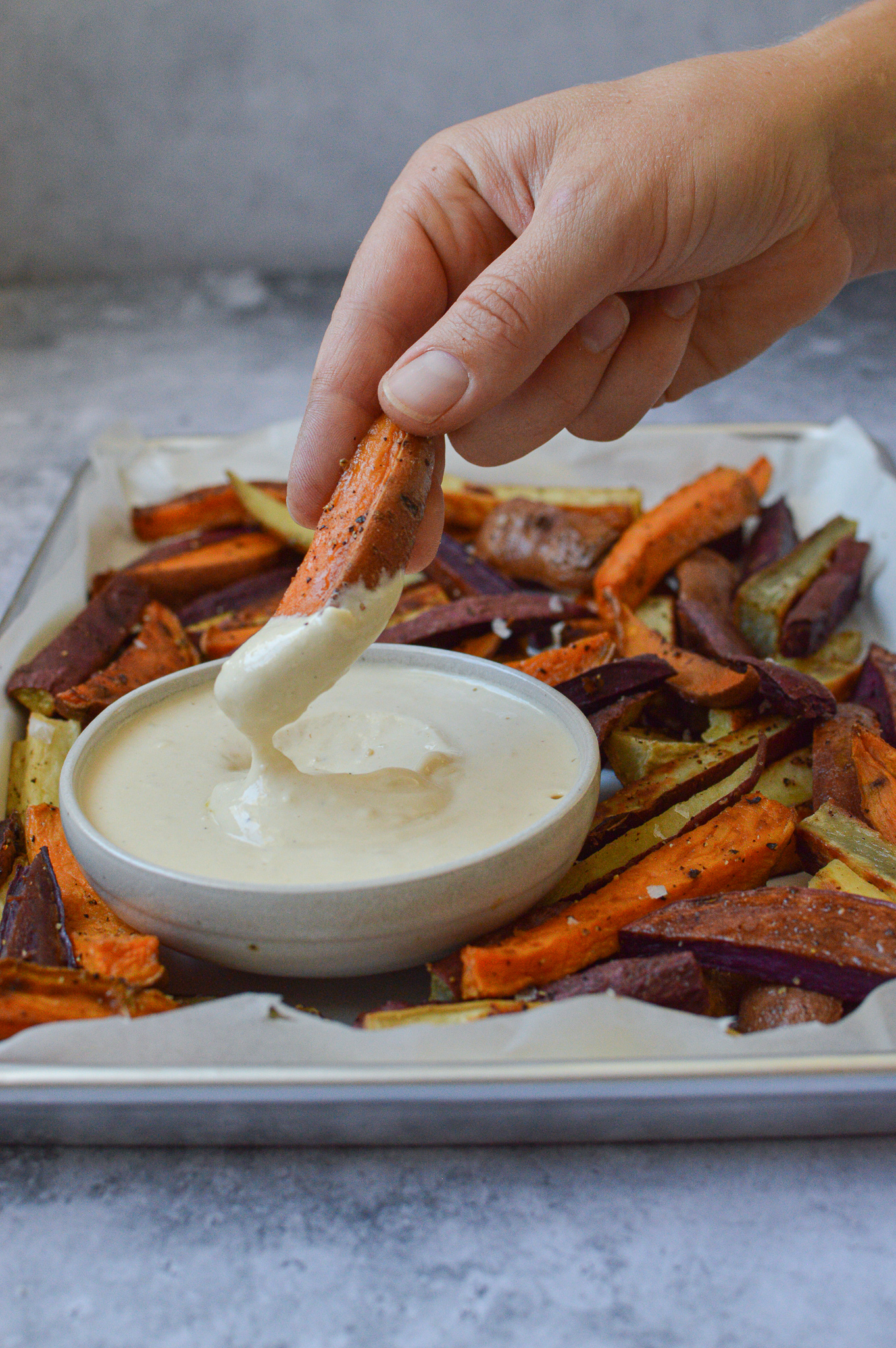 Serve the sweet potatoes with the tahini ranch on the side. Enjoy!