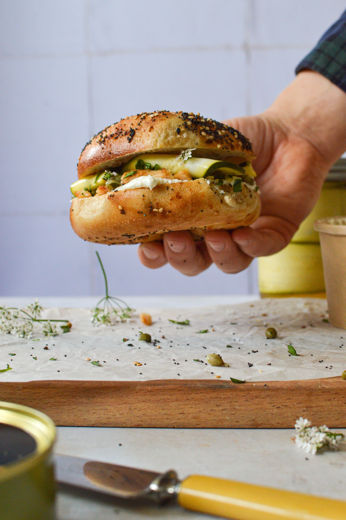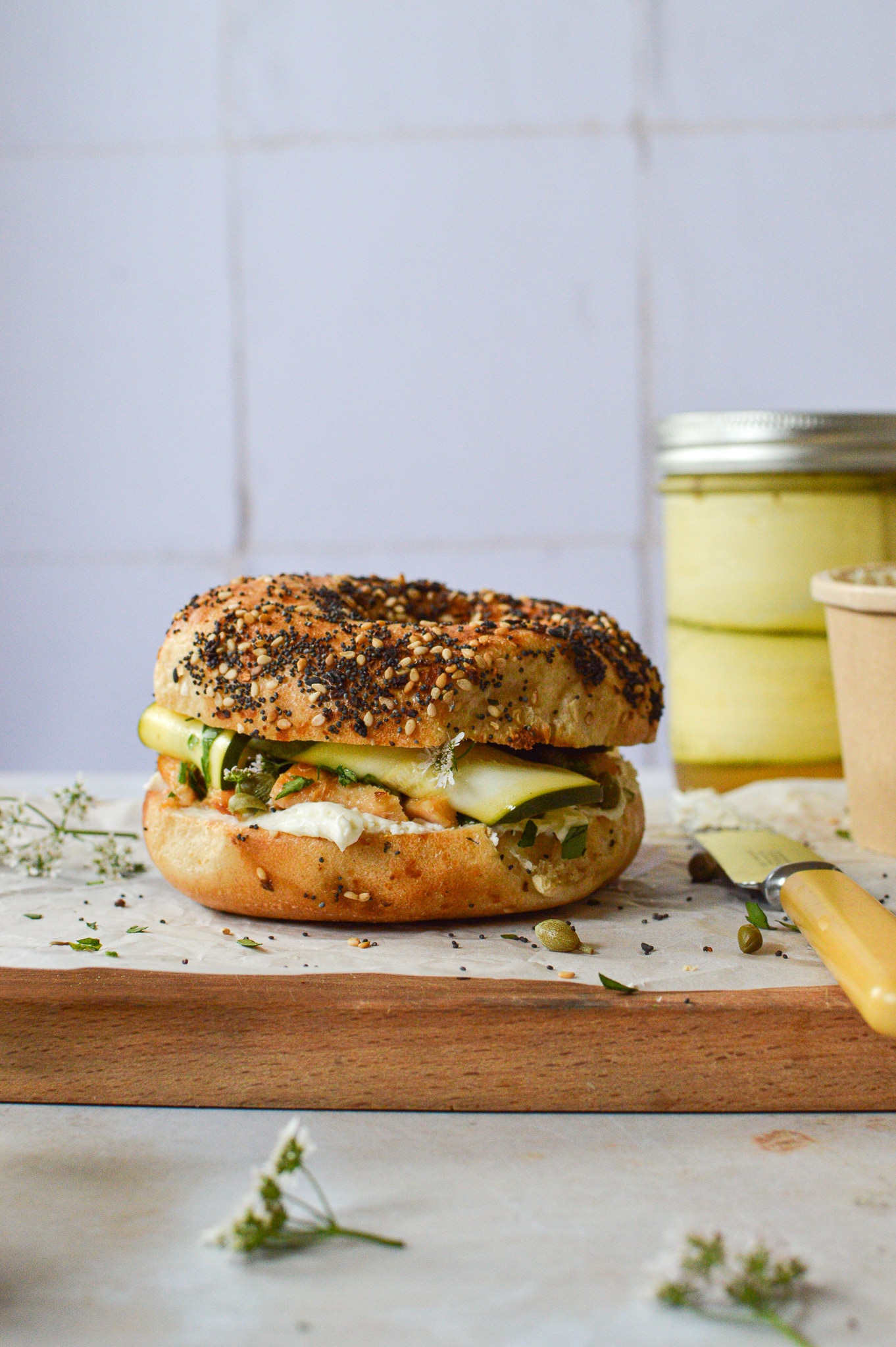 Once you’ve pickled the zucchini for enough time, toast your bagels in a toaster and, once cool enough to handle, smear each side with as much cream cheese as you’d like (I load mine up). Top with flakes of smoked fish and sprinkle with chopped capers, herbs, and 2-3 ribbons of pickled zucchini per bagel half (I like to twist them so they look a bit more fun and fancy). You can double up the halves and eat it like a big sandwich, or eat each half on its own (my preference—you’re basically getting two for the price of one). Enjoy!