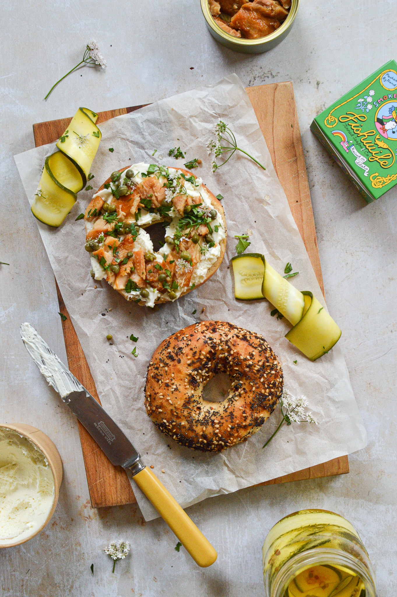 Toasted Bagels with Smoked Fish, Capers, Pickled Zucchini, & Herbs
