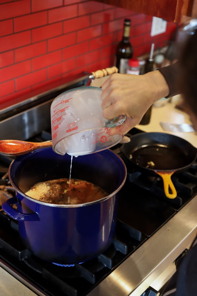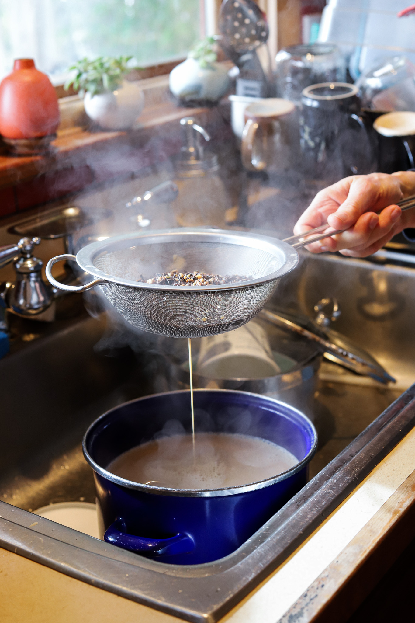Once you’ve completed 5-7 up-and-downs, take the pot off the heat and cover with a lid for two minutes. Strain your chai and decant into a thermos, or enjoy immediately, ladled into mugs and top with freshly whipped cream. Enjoy!