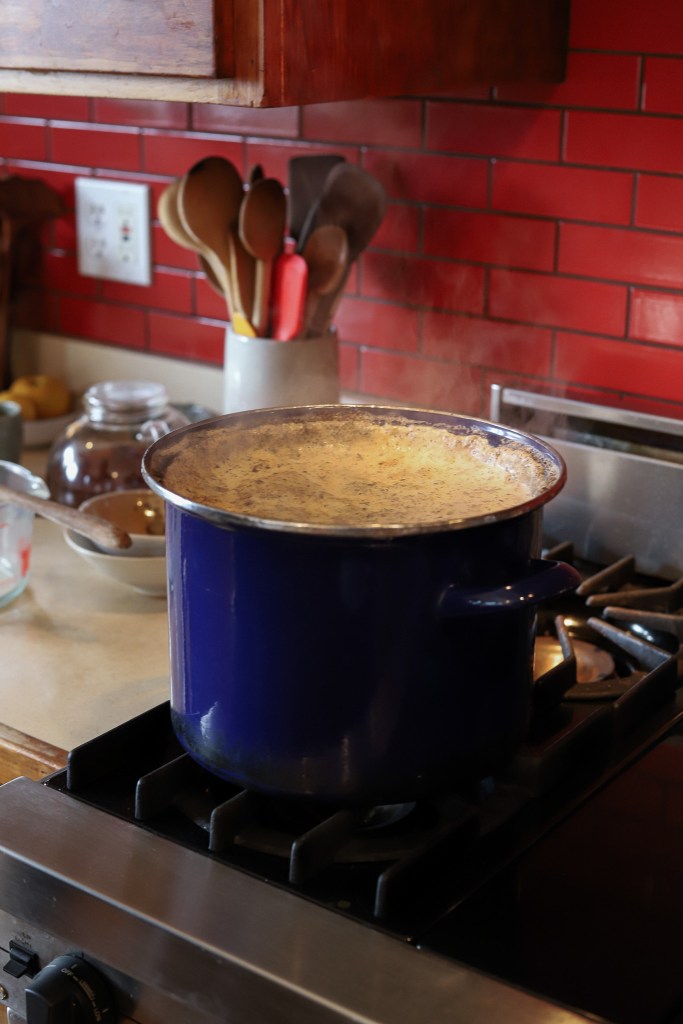 Once the mixture comes to a boil, let the chai boil up as high up the pot as it will go on high heat, then turn the heat off and let the liquid fall back to the bottom of the pot. Repeat this up and down process another 5-7 times (this is the magic and most important step of the method, as it caramelizes the milk and adds a rich depth of flavor), until the bubbles are no longer foam-like but larger, uniform, and more open. Note that the chai will boil up much more quickly the first couple of times, so watch the pot very carefully! The boiling will slow down as the milk becomes caramelized. If your chai is struggling to climb the pot, place the lid on top for the up and down process, leaving a sliver open so you can monitor the progress up the pot. Remove the lid to allow the chai to drop down again.