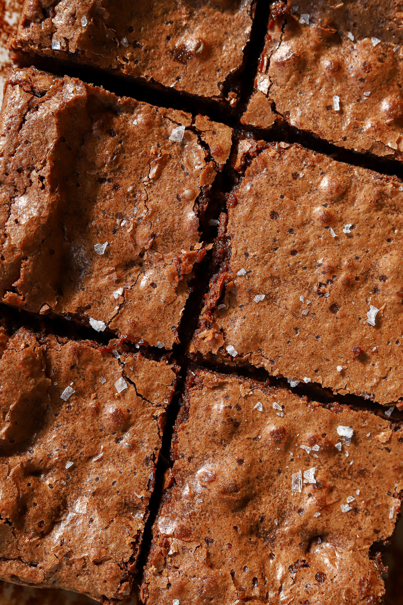 While my intestines may not be able to withstand the onslaught of so much decadence all at once like they used to, I still crave a hefty square of chocolatey goodness every now and then. When I do indulge I want them to be richly chocolatey, a little gooey and chewy, and so satisfying, just like they were when I was younger. When I think brownie, I picture the quintessential, regular ol’ basic brownie: no frills, no nothing besides the hero flavor, chocolate. There’s a time and a place for those brownies—made with rye flour, nuts, or topped with everything from caramel or pretzels to coconut—but most often the recipes I come back to over and over are the simplest ones.