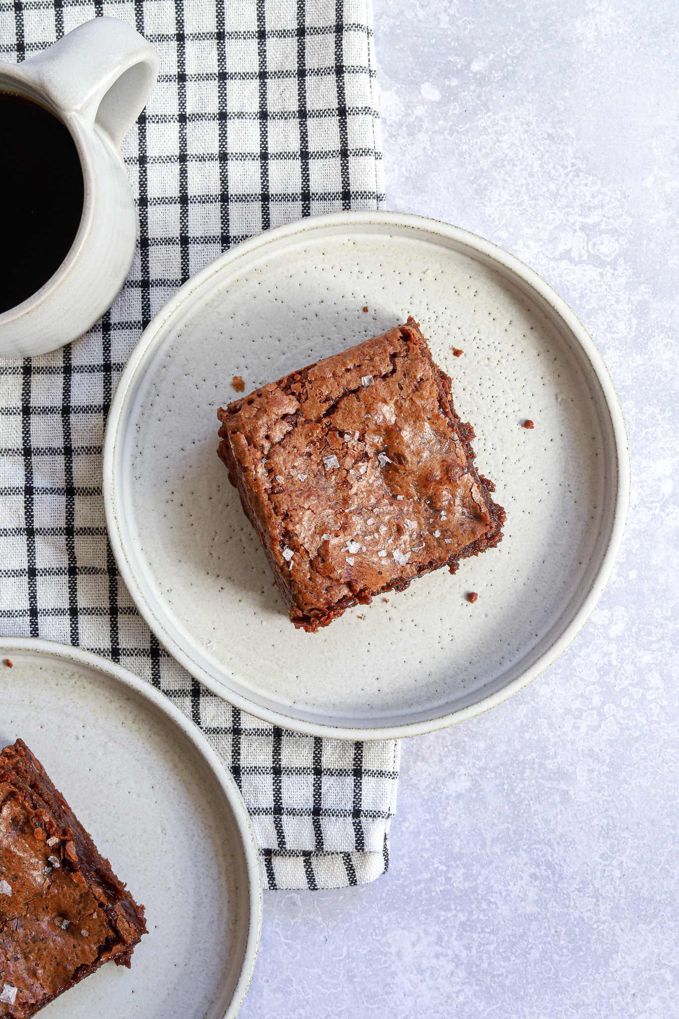 Pour the brownie batter into your prepared tin and smooth the top. Bake for 30-35 minutes for a fudgier brownie (until a toothpick inserted into the middle comes out mostly clean; you want to take them out before fully clean so as to retain that fudge-like center), or 35-40 minutes for a slightly cakier brownie. Sprinkle immediately with a couple pinches of flaky sea salt, if using. Let cool fully in the pan, then lift out and cut into 9 or 16 squares. Enjoy at room temperature, ideally.