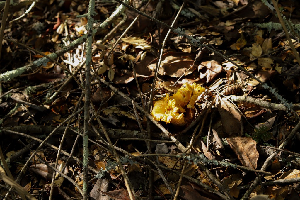 Fortunately for me, my brother- and sister-in-law found a hefty supply of chanterelles on their property during the rainy season the last couple of years, sending us pictures of baking trays full of the frilly yellow ‘shrooms. Last year we finally went with them on a trek through the woods, learning to keep a keen eye out for flashes of gold amidst the thick layer of dead leaves whilst trying not to slide down the steep hillside. Prying the mushrooms’ thick stems from the sodden earth, we’d add each meaty nugget to the communal basket until we had quite a pile. We learned to discard the ones too soggy from the rain, which wouldn’t cook up well.