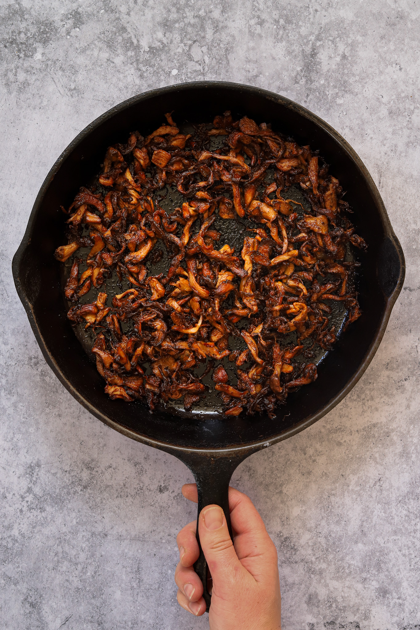 Heat 3 tbsp lard in a large cast iron skillet over medium heat until very hot. Drop your shredded mushrooms into the pan and toss to coat, then let them cook for a couple of minutes. Stir every now and then—you want the mushrooms to crisp and brown, but not burn, so adjust your stirring intervals and/or heat as needed. Continue cooking the mushrooms for about 40-50 minutes, until very brown and quite crispy. Toss with 1/4 tsp fine sea salt, taste, and add more salt as needed.