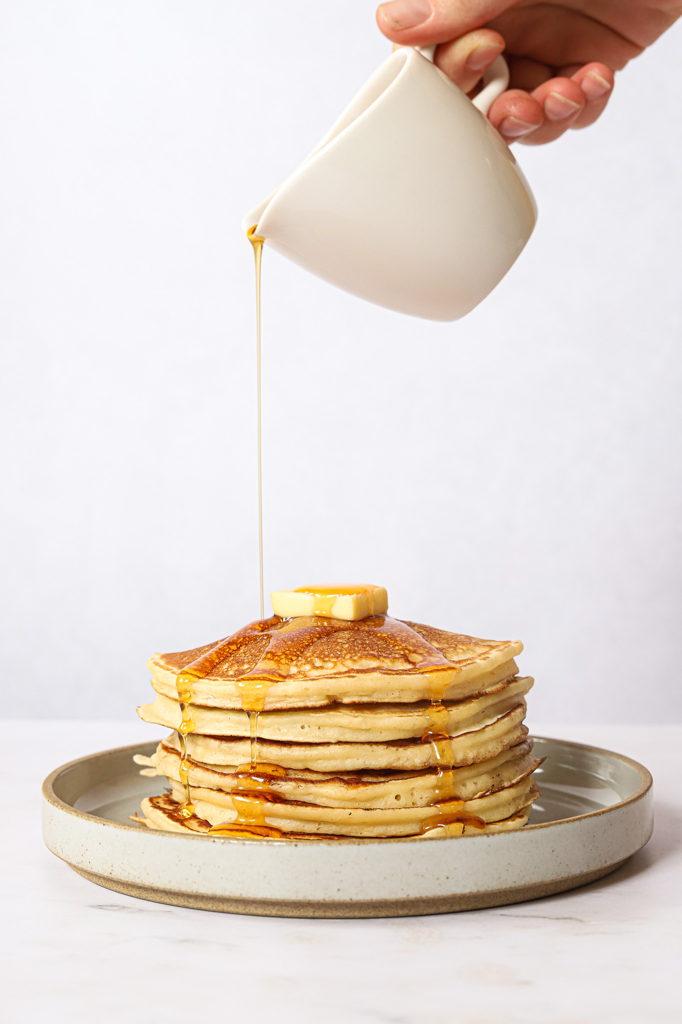 Serve with butter and maple syrup at minimum, but feel free to also serve with whipped cream, fresh berries or a berry compote, or anything else you like to eat pancakes with. Enjoy!