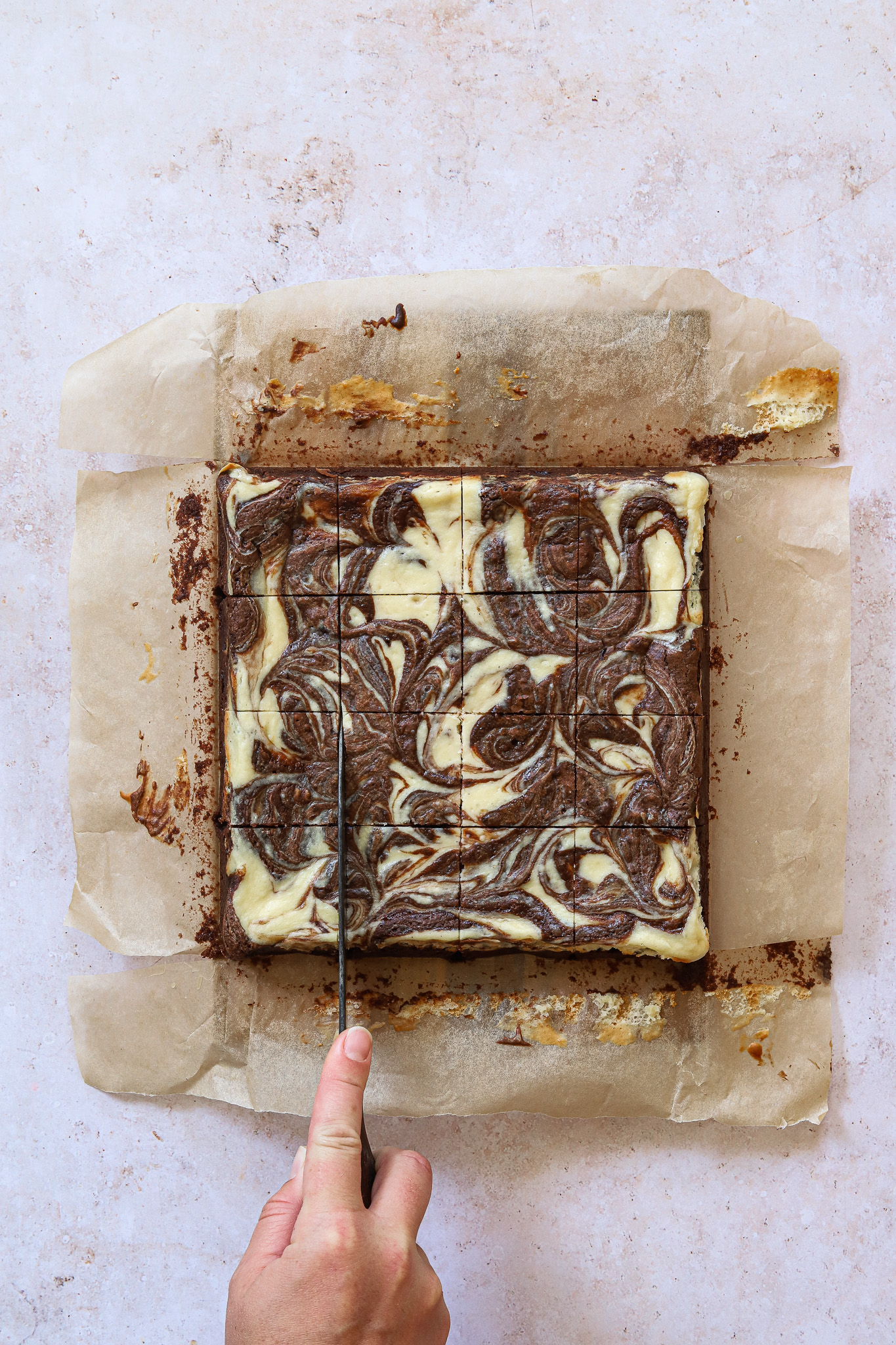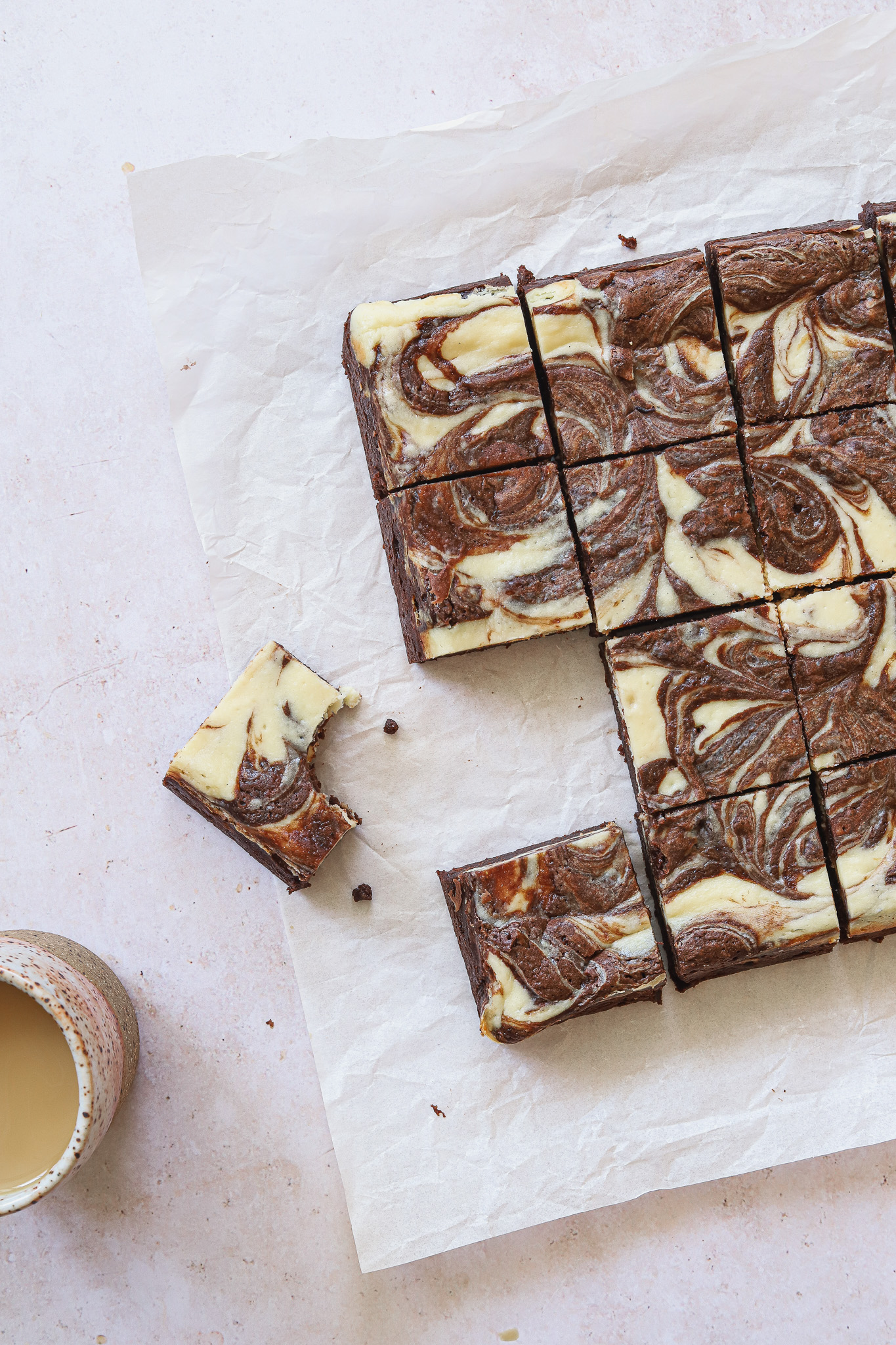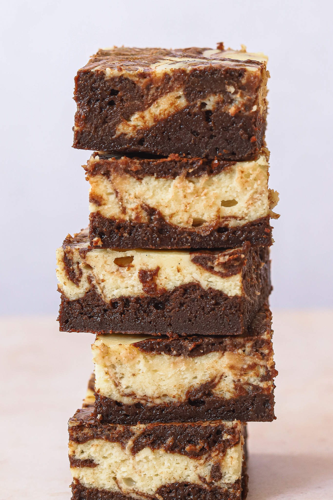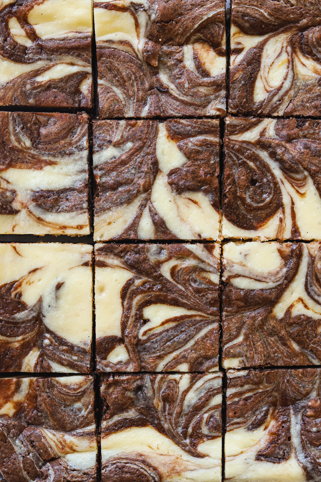 My cheesecake brownies are not quite as gut-destroying as the ones from my childhood memories, which means you can eat more of them (blessing or curse?). But they’re just as satisfying, not to mention quite beautiful to look at—who doesn’t like seeing chocolate swirled in dramatic contrast with cream cheese? They’re fudgy and rich, which is everything I wanted them to be. I prefer them completely cool, perhaps even cold, and recommend keeping them in the fridge after they’ve cooled.