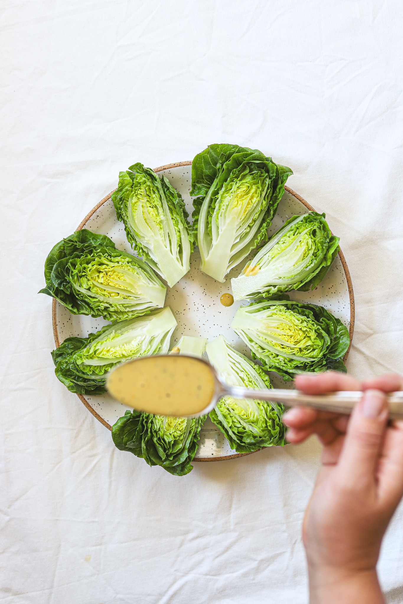 Tear off any bruised or battered outer leaves of the little gems. Slice the very tip of the root end off to remove any brown spots, then slice each little gem in half, lengthwise. Rinse them well under cold water, then dry on a kitchen towel, or gently wash them in a salad spinner.