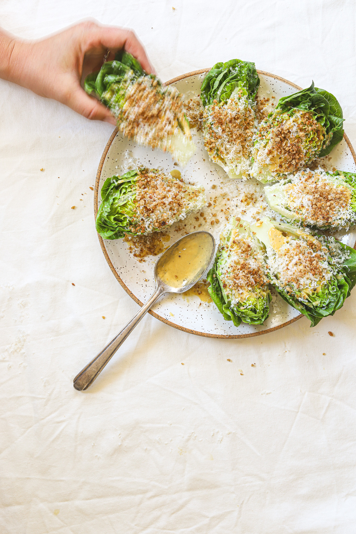 I’ve only made it to a handful of Farmer’s Markets since Wren was born, especially since they tend towards being super hot and I don’t greatly enjoy the sweat-fest that is having a baby strapped to my chest while I tow a toddler and groceries in a cart. When I’ve screwed my courage to the sticking place and done it, I have been rewarded with summer’s bounty; fat, fuzzy peaches, hefty green cucumbers, the shiniest, reddest strawberries, and succulent little gem lettuces. It’s certainly made my meal planning more exciting; this dish was born out of that market-induced inspiration. It feels like summer eating at its best, featuring peak, fresh produce without much done to it at all. Perfect, crunchy little gem lettuces are sliced in half, then drizzled with an easy, creamy homemade caesar dressing and sprinkled with garlicky panko and parmesan. It’s a side. It’s a salad. It’s maybe even a meal (lunch, though, let’s be real; I would starve if I only ate lettuce for dinner).