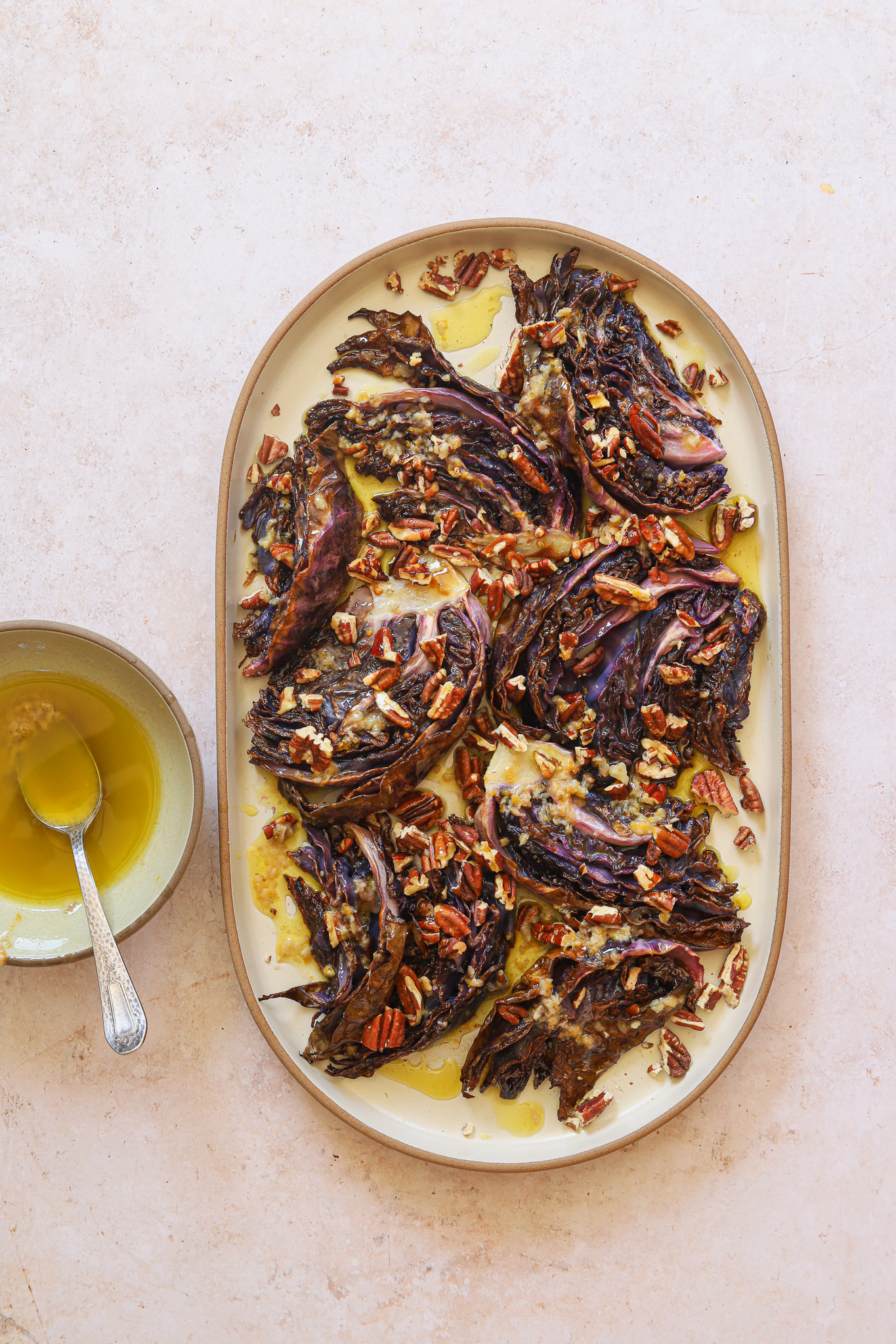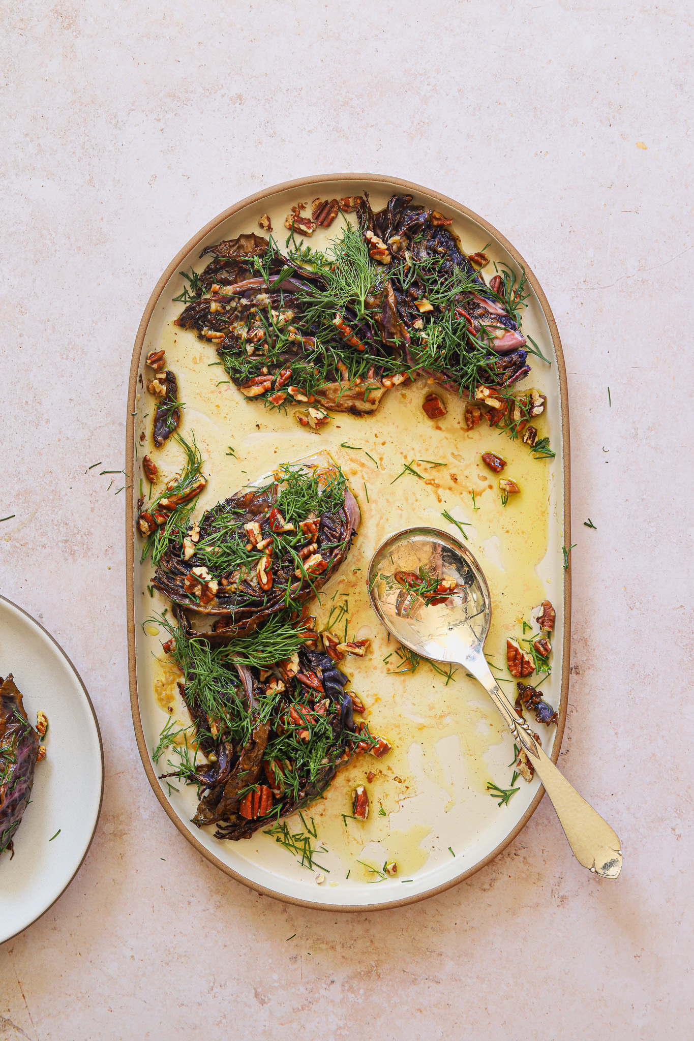 Once everything is ready, lay the roasted cabbage in one layer on a platter or shallow serving bowl. Roughly chop the pecans and scatter across the cabbage. Drizzle with the dressing, making sure to coat each piece of cabbage. Sprinkle with the rest of the chopped dill. Eat while still a little warm or at room temperature. Enjoy!
