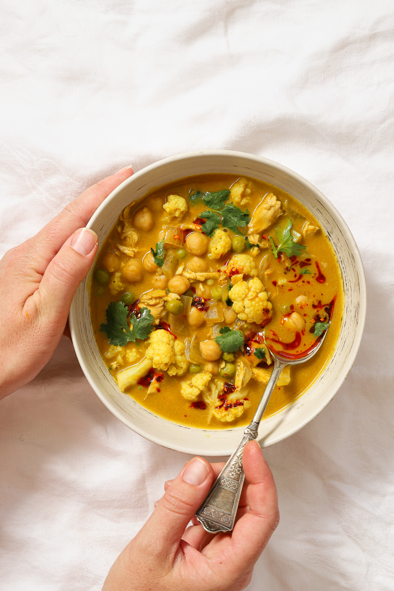 This warming, sun-colored curry ticks all my cool-weather boxes. It’s one of those versatile recipes that is essentially a blank yet flavorful canvas; it starts out naturally vegan, but add a few handfuls of shredded chicken and it becomes omnivorous. We have a few close friends who are vegetarian, and it’s lovely to have a solid recipe that everyone can enjoy without having to consider substitutions or someone being told to stop by the store for veggie burgers.