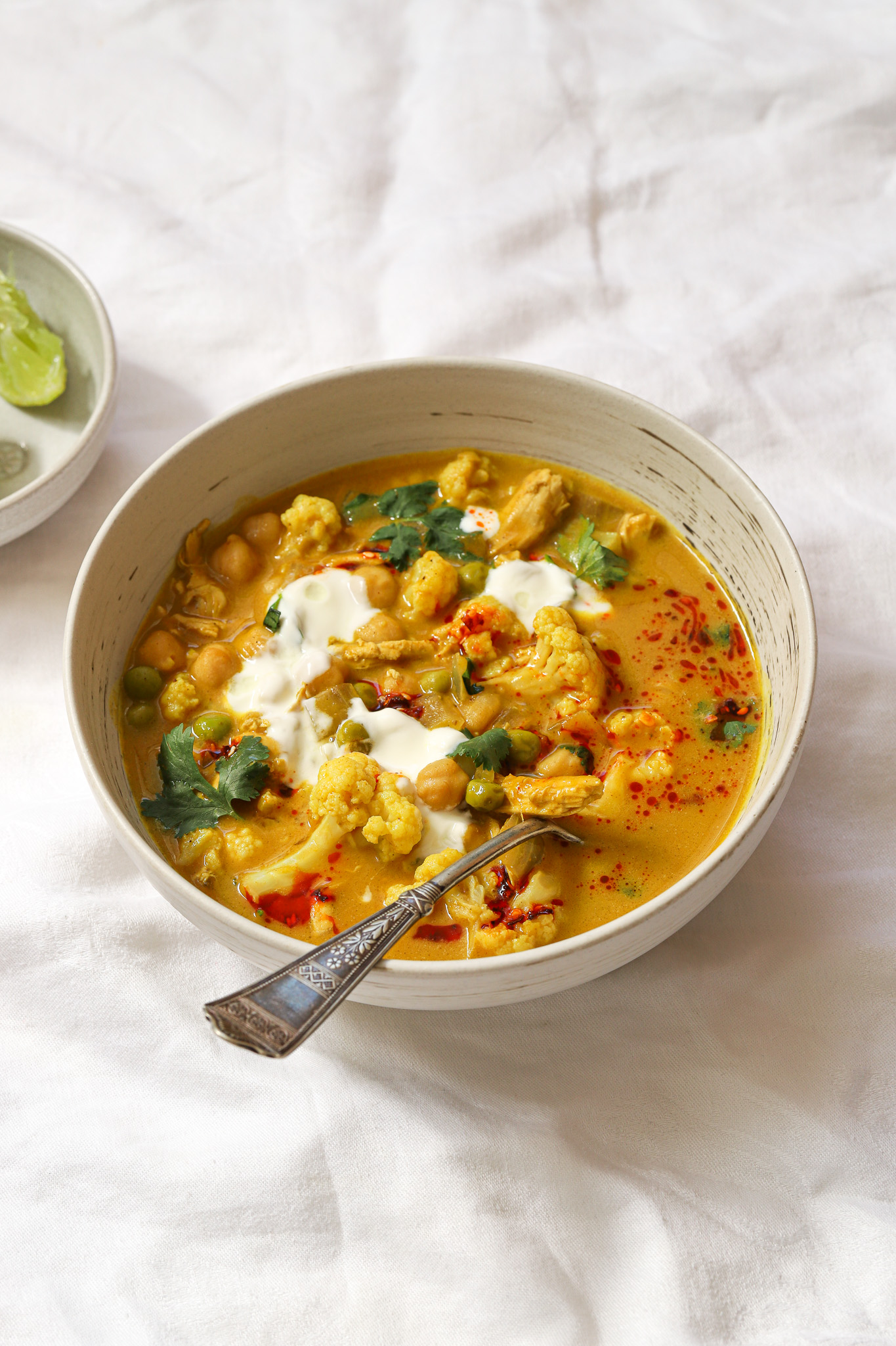 Stir in 1 cup of water, drained chickpeas, 2 cans full-fat coconut milk, 2 cans pumpkin purée, and 4 tsp fine sea salt. Toss in the chopped cauliflower and tofu or chicken, if using, and bring to a simmer. Continue to simmer the curry for about 15 minutes, stirring occasionally, until the cauliflower is cooked but not mushy. Stir in the chard or spinach, 1 cup frozen peas, and 1 ½ cups chopped fresh cilantro, then squeeze in the lime juice. Taste, and add lime juice and salt as needed. Let simmer for a few more minutes, until the greens are wilted.