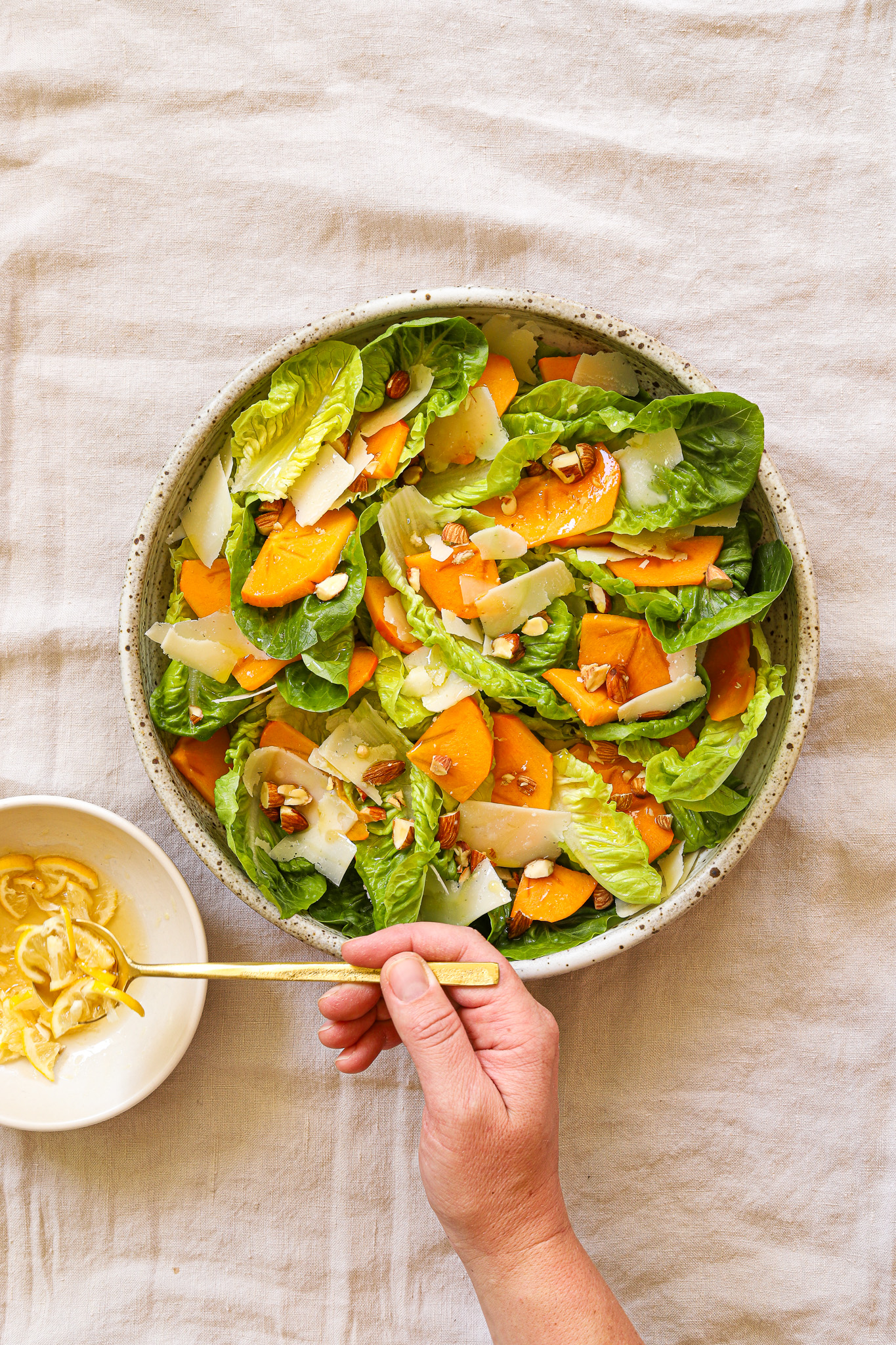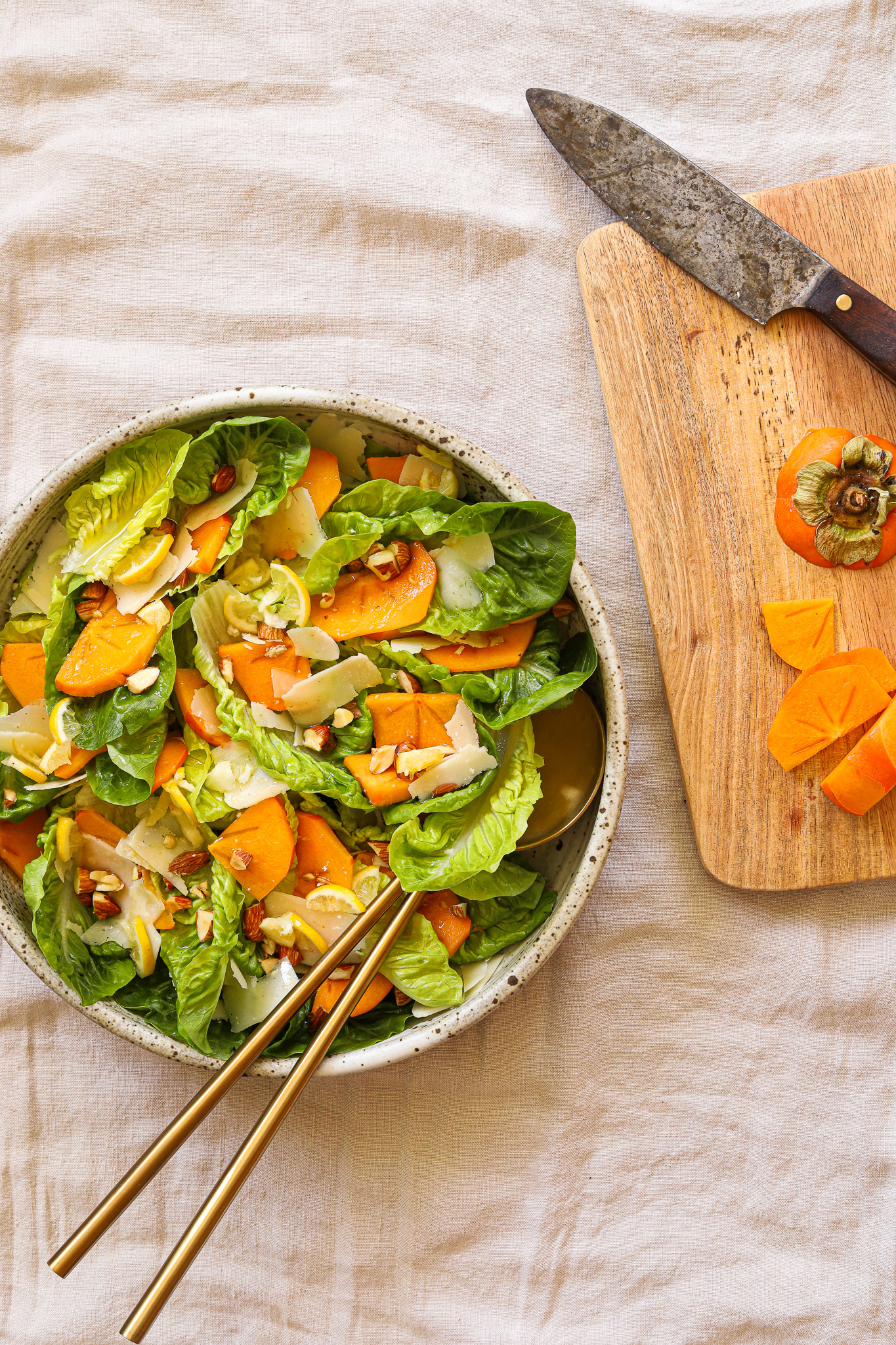 Slice the ends off of the persimmon and peel if the skin is particularly tough (feel free to leave the skin on—do what makes you happy). Cut the persimmon in half through the top, then lay each half on its side and thinly slice into half moons. Cut the halves in half again, if you want bite-sized pieces, or leave as semicircles. Sprinkle the fruit over the lettuce, then top it all with 3 tbsp chopped roasted almonds. Shave parmesan over the top—use your judgement, but I always go for more rather than less.