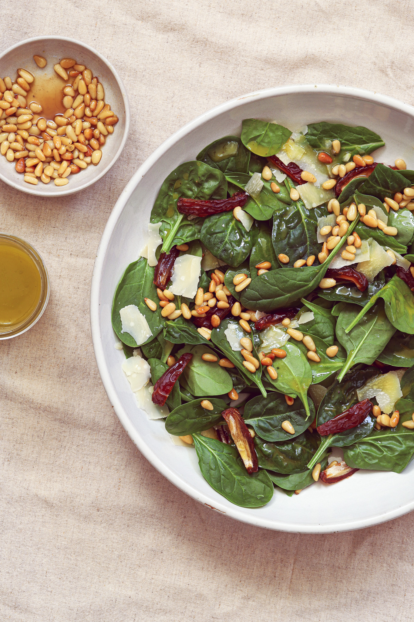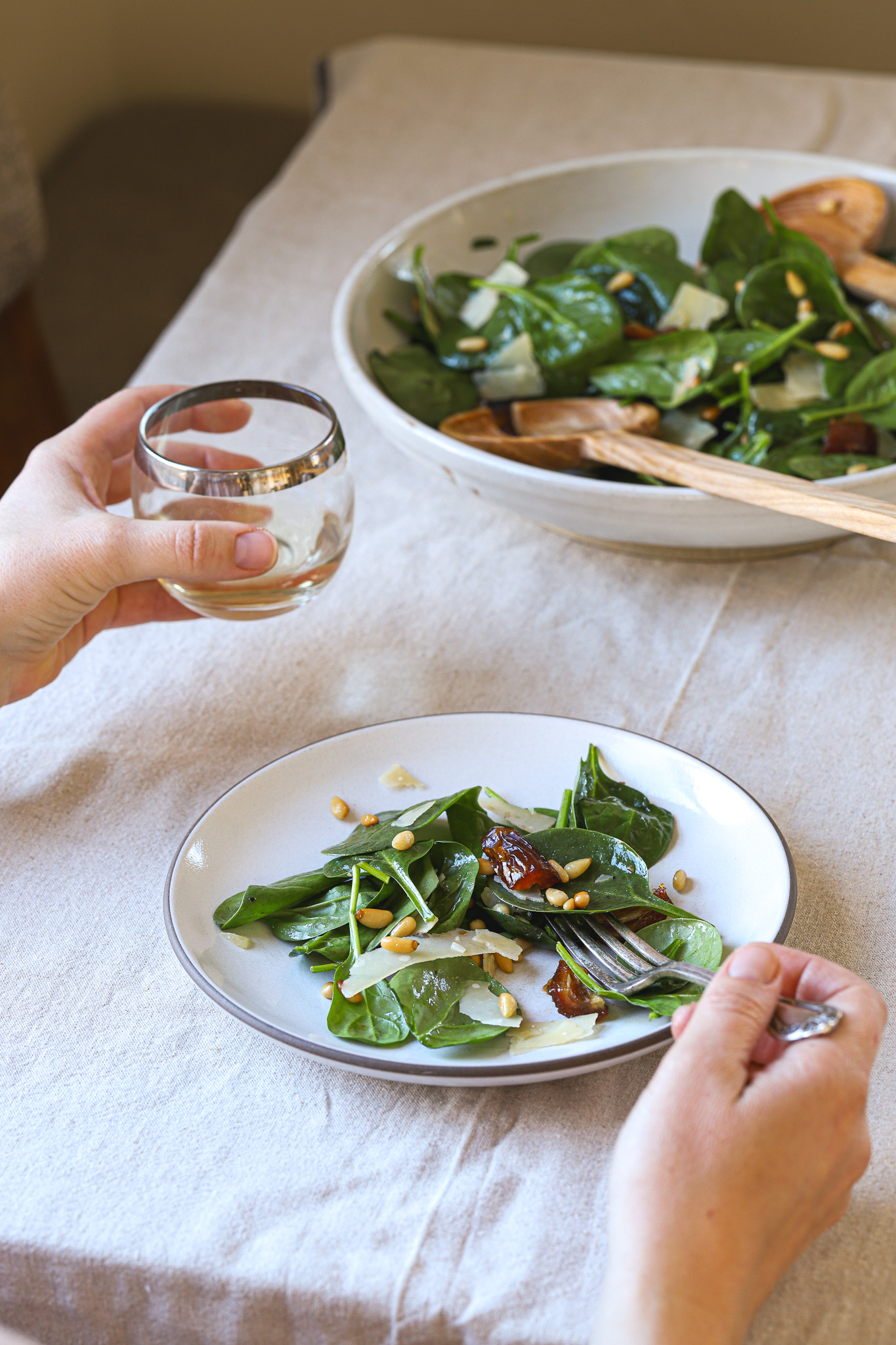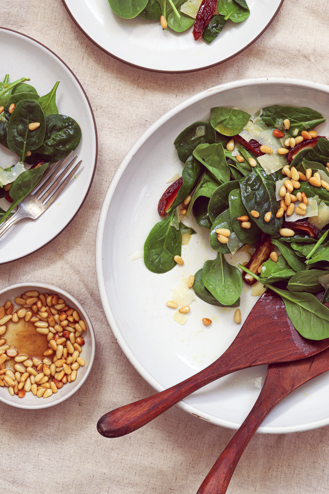 I’ve noticed that spinach is often the less-than-welcome gateway salad green for a lot of people. Topped with carrot shreds, unripe cherry tomatoes, and an overly complex store-bought dressing, it can be incredibly lackluster. With the proper accompaniment, however, spinach shines as the truly fantastic salad green that it is. It’s hearty, tender, and (bonus) super healthy; spruced up with bacon-y, toasty pine nuts, sweet date chunks, and salty parm shreds, you will want to eat this every single night in Fall and Winter.