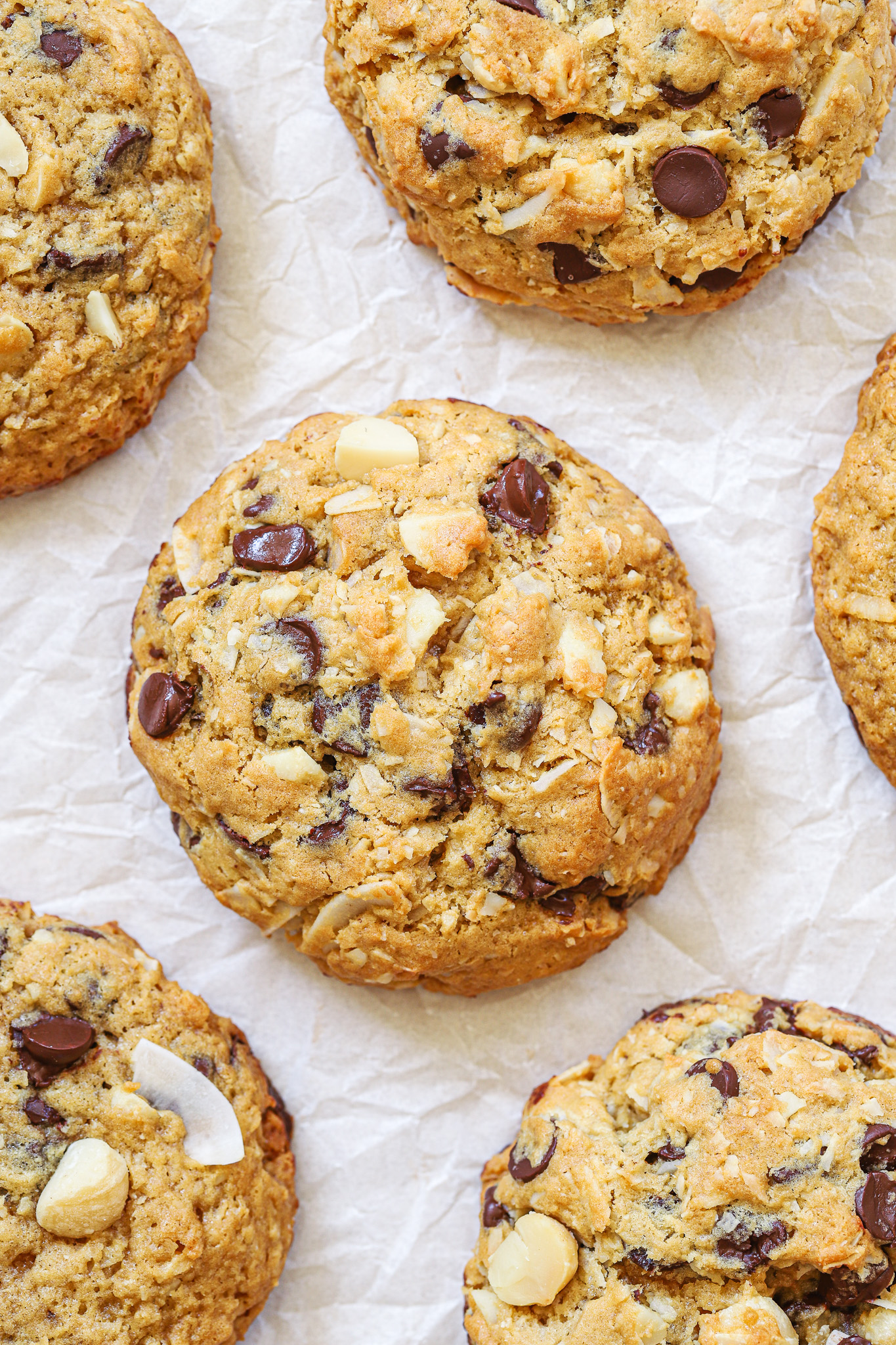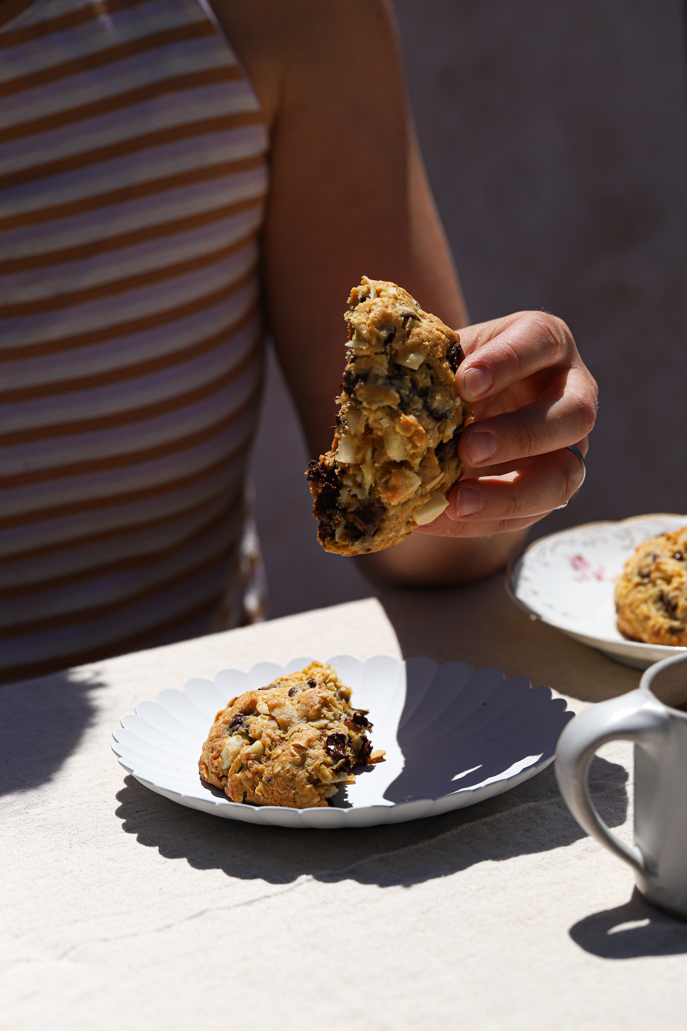 At 4am on the day Wren was born, just two hours after he had been transported from inside my body to the outside world, Jonji and I figured we should order a snack before trying to get some sleep. Wren was all cozy and wrapped up on my chest, nursing away quietly and methodically; we couldn’t stop staring at his sweet squishy face, his perfect miniature fingers and toes. Jonji called room service and ended up ordering a smoothie and the “Royal Cookie.” I wasn’t so into the idea of eating anything too sweet at that moment, but after I took one bite of the cookie I kept going back for more until, suddenly, it was all gone. It was chewy, hefty, and full of satisfying chunks of coconut, chocolate, and macadamia nuts; almost like a granola bar, but better. Later that day, after we’d gotten a little sleep, we ordered another one and it was just as good as the first. My sister, Bailey, gave birth to her third child last year at the same birthing center and I recommended the Royal Cookie. She texted me the next day, “Trying to assess how many of those royal cookies are acceptable each day. Two? Three? Four?” She’s also told me recently that it might be worth having a fourth child just to get more of those cookies. Sure, that might sound insane, but that’s just how tasty these cookies are.