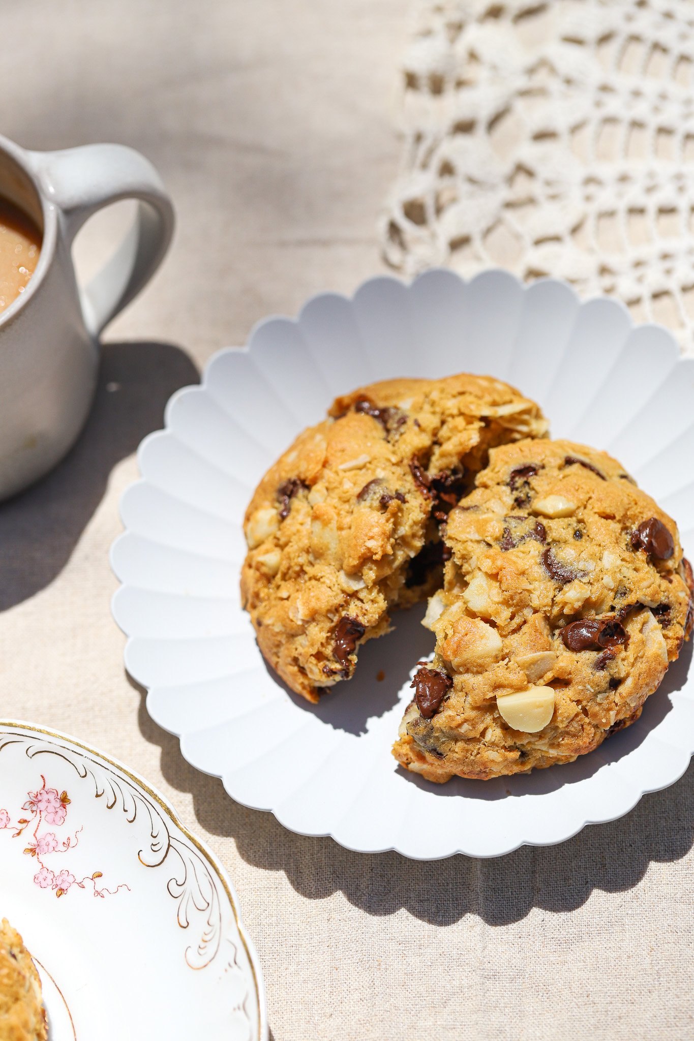 In the quiet of caring for a newborn, I realized I had to recreate Sutter’s Royal Cookies for the blog. The only question was when I would have the time. Here we are, seventeen months later, and I finally found time to reverse-engineer the recipe, shoot it, and post it. It took several iterations and a lot of giant frozen balls of cookie dough in the freezer to get it right, but I think I finally cracked it. My starting point was a recipe that echos the famous cookies from Levain Bakery, which are notorious for being very chunky. My cookies are very generously portioned, chock-full of chocolate, coconut, and macnuts—they are not light on fat or calories, but they are worth every bite. They’re a bit gooey, a little chewy, and very satisfying. I might go as far as to say they’re fit for a queen.