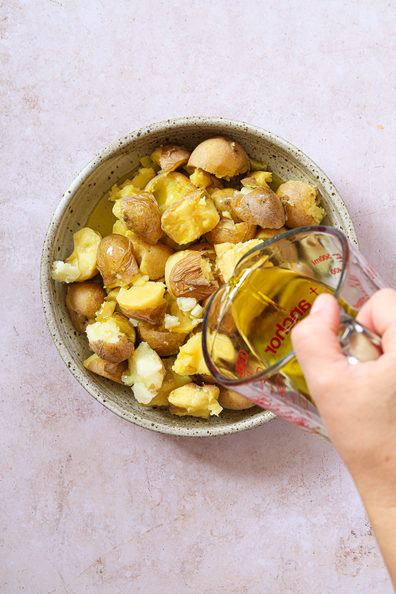 If your potatoes are larger than a golf ball, cut them in half or quarters so they’re all roughly that size. Place them in a large pot and cover with cold water. Stir in ¾ cup Kosher salt and bring to a boil over high heat. Boil for about 5-10 minutes, until easily pierced with a knife (you won’t be cooking them any more than this, so make sure they’re a consistency you’d like to eat). Drain the potatoes and let them cool until cool enough to touch with your hands.
