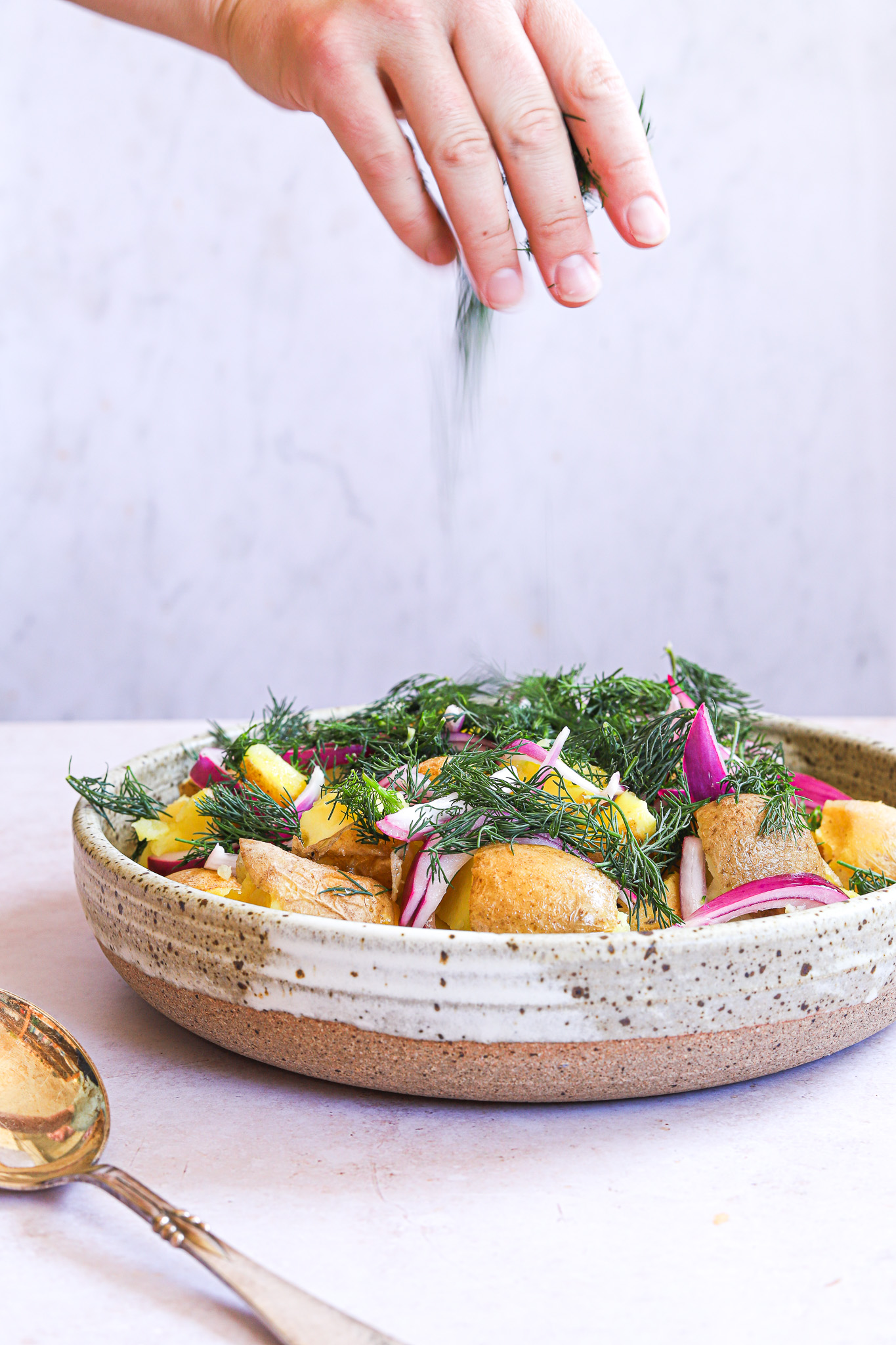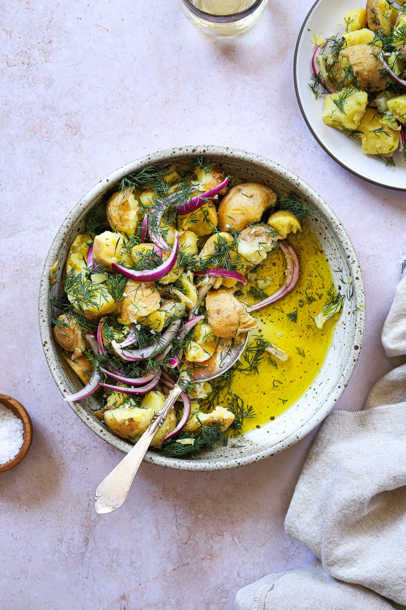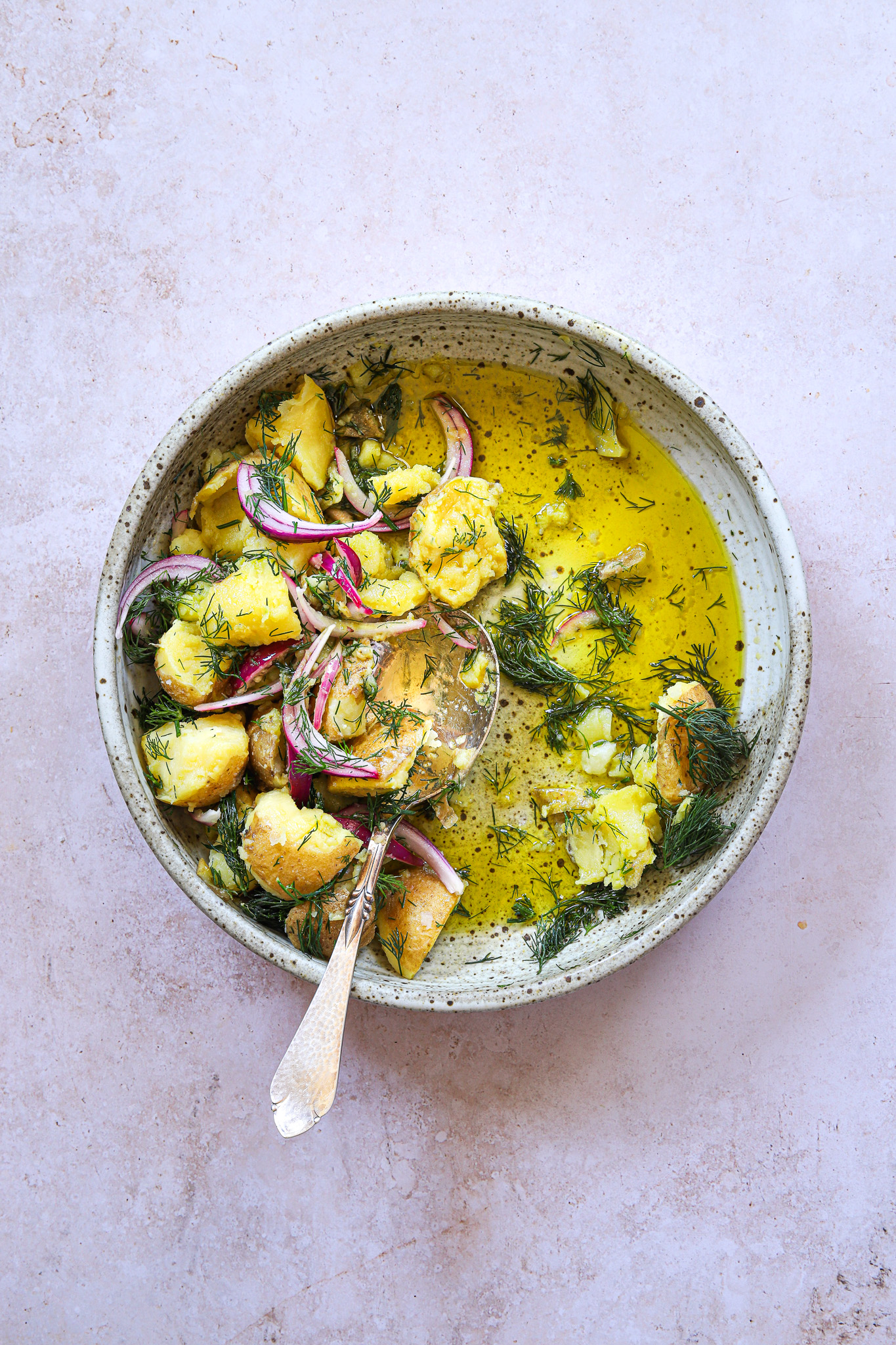 Using your hands, crush and crumble the warm potatoes into a serving dish. You want slightly larger than bite-sized pieces. Douse with ½ cup olive oil, then stir in the pickled onions, the juice from half a large lemon, plenty of freshly cracked black pepper, and all but one handful of chopped dill. Once it’s all mixed, taste and add flaky sea salt as needed, or more lemon juice and olive oil to taste. When it’s to your liking, top with the last handful of dill. Serve slightly warm or at room temperature. Enjoy!