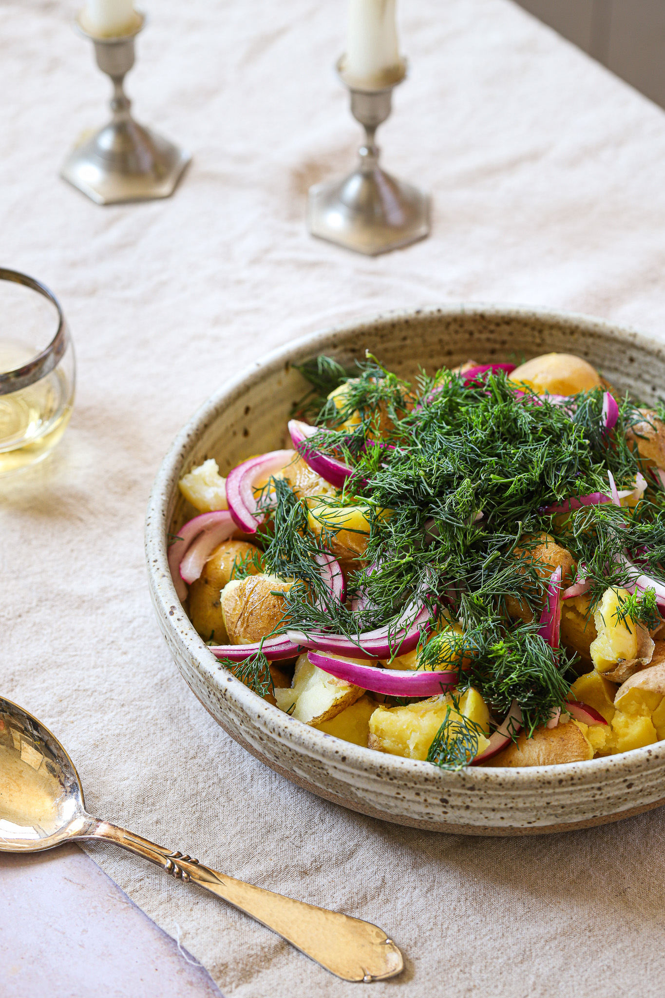As always, when our lives are upended by big changes, I have to scale back my cooking and choose weekly menus that require less time and attention. Enter these potatoes. They’re cooked in very salty water (don’t be afraid, they will not be too salty), doused in olive oil, and scattered with crunchy quick-pickled onions and a shower of fresh dill. I love them, and I think you will too.